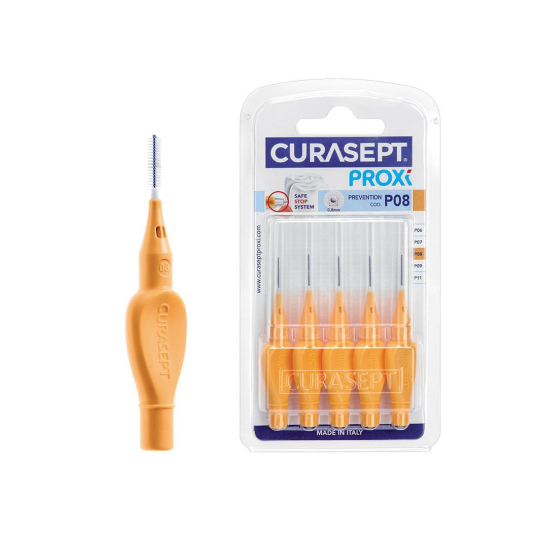 Curasept Proxi Prevention series interdental brushes in the P08 size. This is the ISO size 1 and has a 0.8mm core. Curasept’s mid size Prevention series interdental brush.