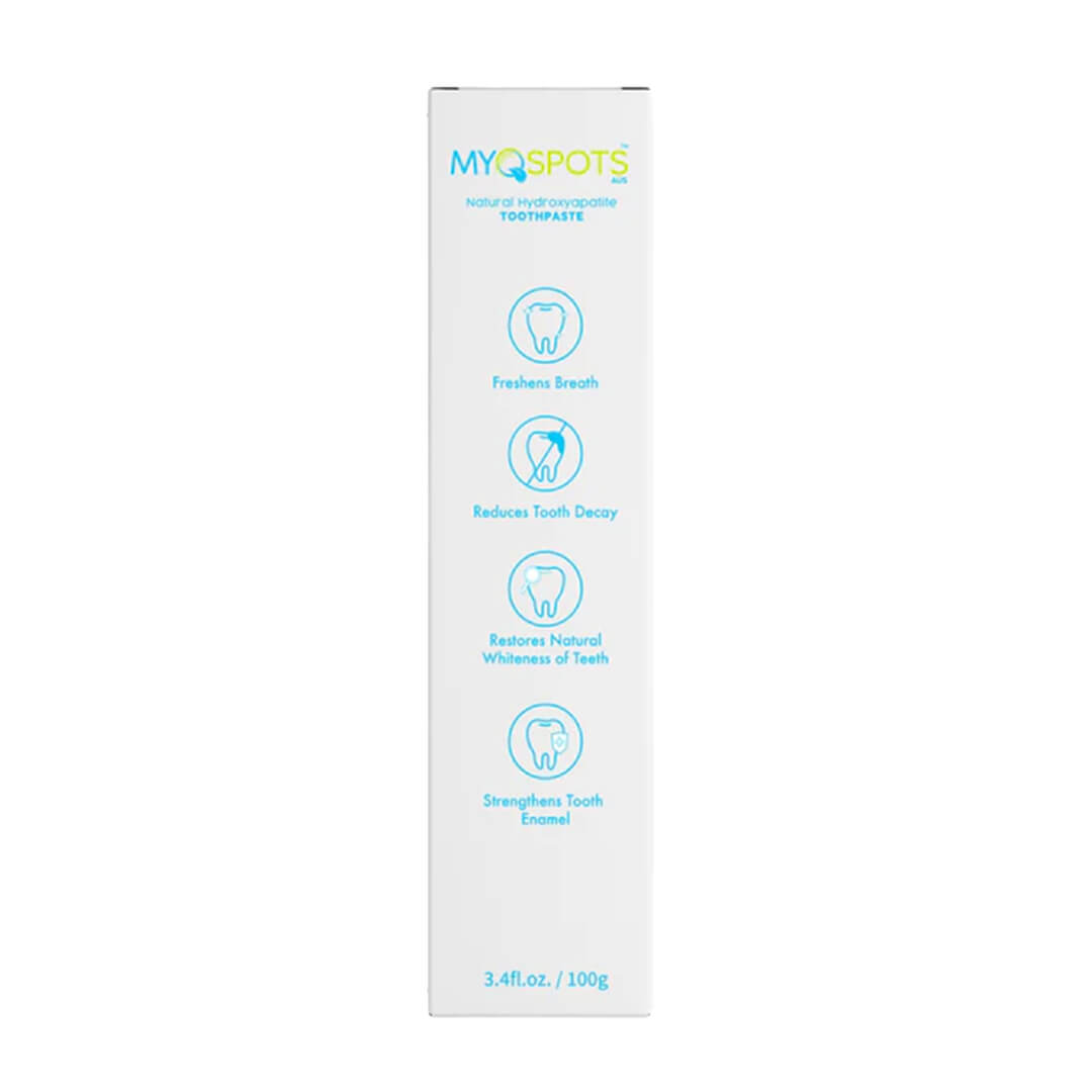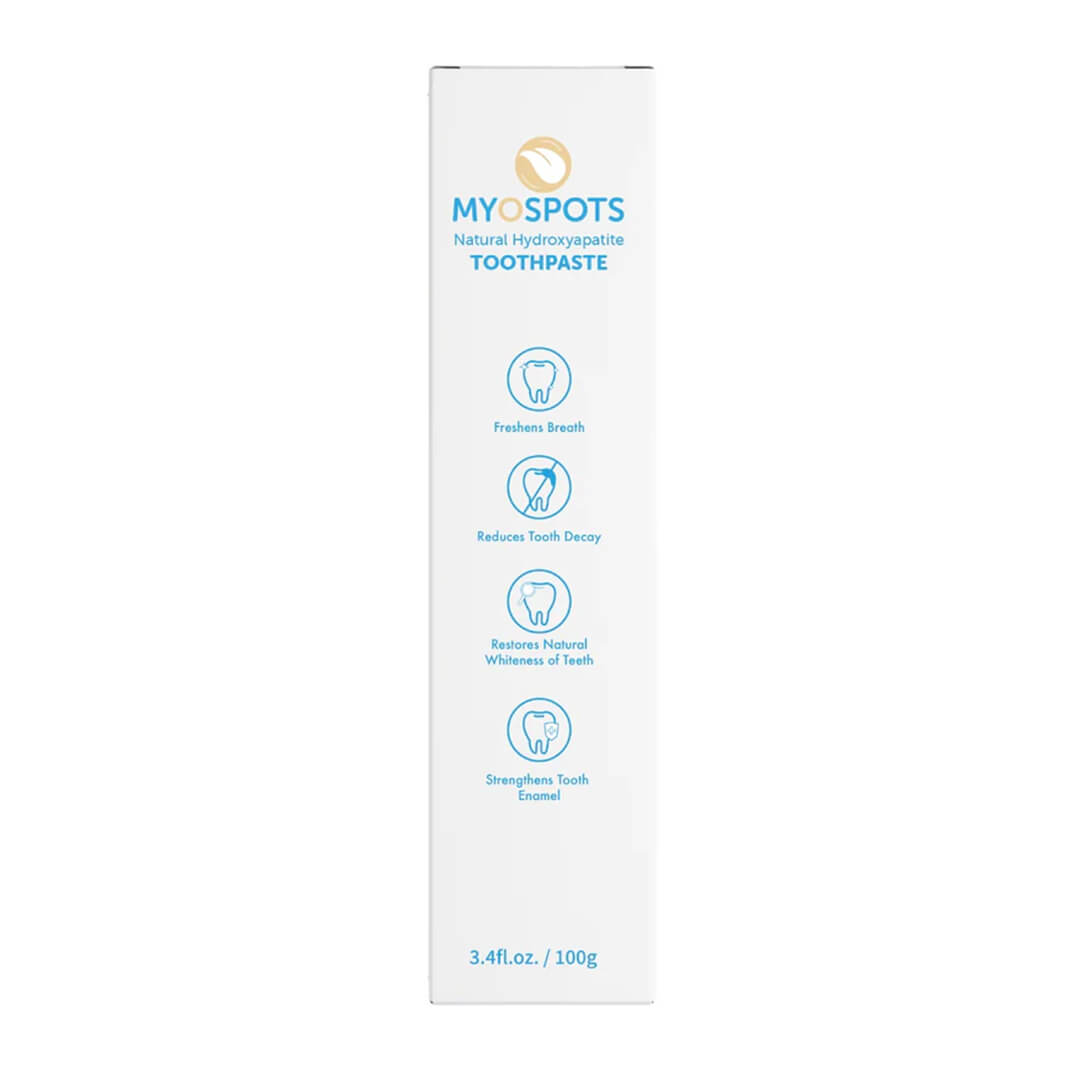 Myospots Natural Toothpaste is fluoride-free and enriched with Nano-Hydroxyapatite, a non-toxic alternative that strengthens enamel and reduces sensitivity while supporting the oral microbiome.