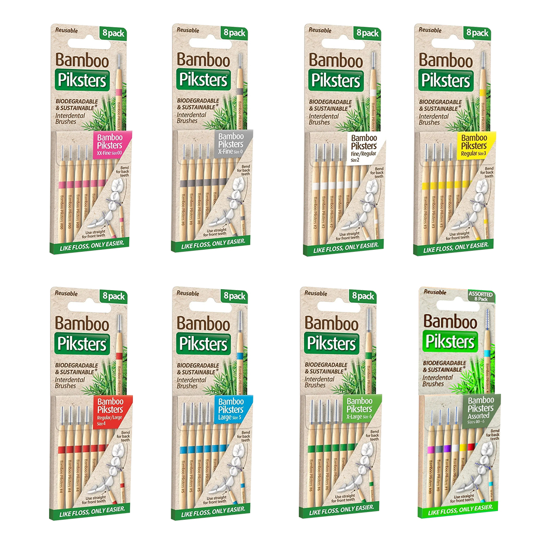Piksters Bamboo are available in: Straight Handle (Sizes 00-6 in 8pks or 32pks) or Right-Angle Handles (Sizes 00, 1, 3 and 5).