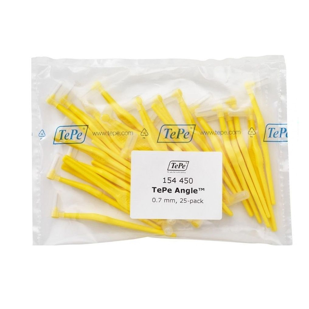 The wire is plastic coated for safe and gentle cleaning around natural teeth and implants. TePe Angle interdental brushes have a long handle and angled head allows easier access to the back teeth from the inside and the outside.